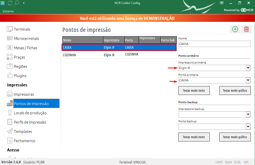 Após o teste de impressão sair corretamente, entrar no aplicativo colibri em pontos de impressão colocar o modelo e identificar o nome da impressora instalada na porta primaria.