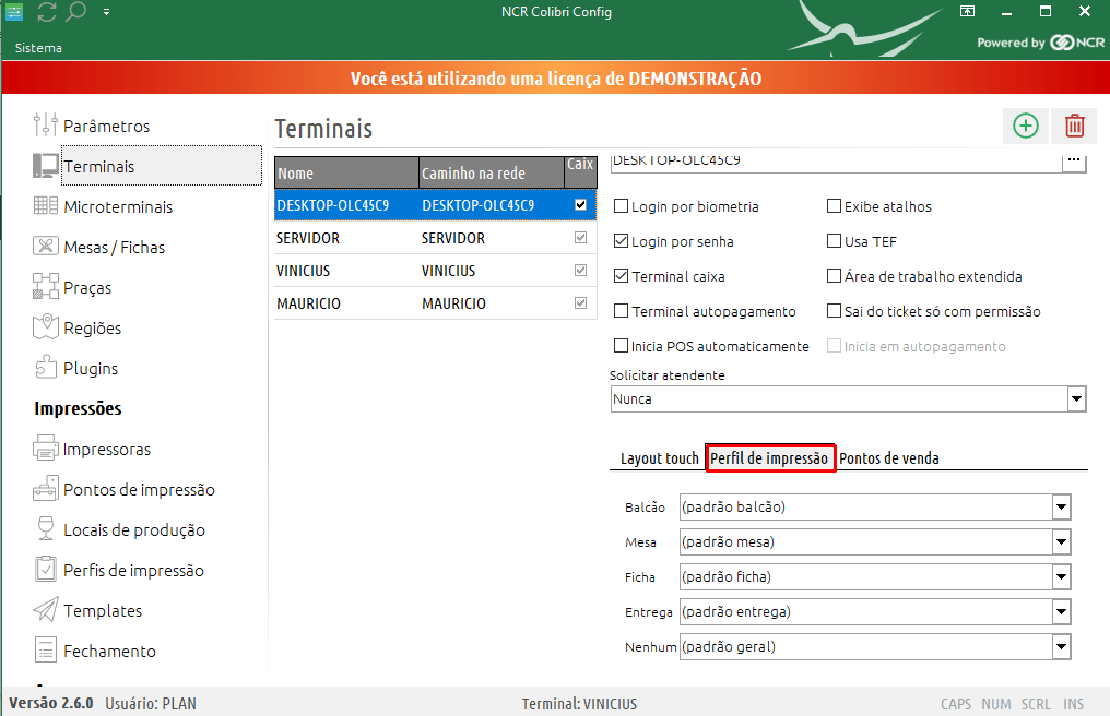 Ir em terminais e certificar-se de que os perfis estão corretos